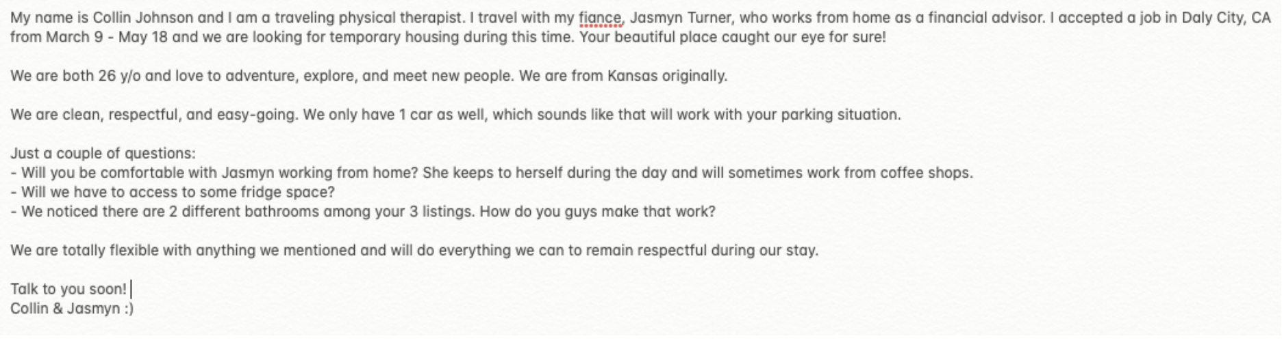 Be weary of places that want a bunch of your personal information. We’ve had landlords ask for our social security numbers and banking information before we even met them (for an application/background check). This same landlord treated getting on the phone with us as a big hassle. That's a huge red flag. Bye Felicia.